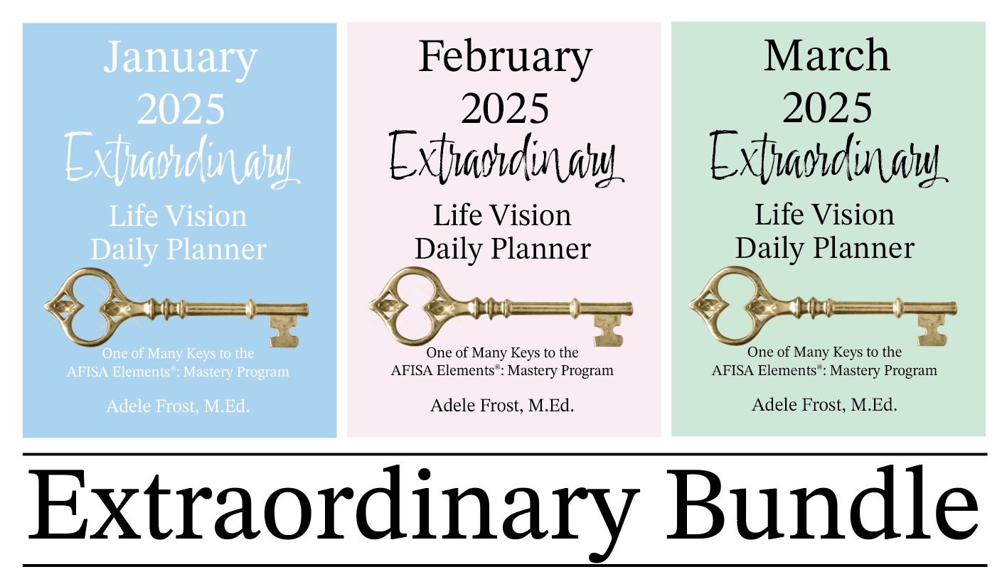 Use the AFISA Elements process of organizing your annual goals through the AFISA Elements Scheduling for Success Worksheets and the Extraordinary Bundle of the Life Vision Daily Planners January-March 2025!