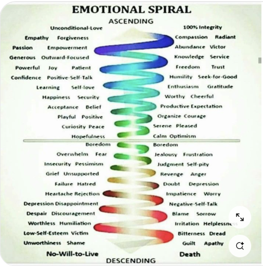 3. I review the Emotional Spiral graphic of Ascending and Descending Emotions. By doing this, I can name my emotions for clearly. It's actually in my Lifebook, my personal development plan, as a reference that I look at when I need to, not just during Emotional Month. Here's the exact picture from Pinterest of the Emotional Spiral in my Lifebook.